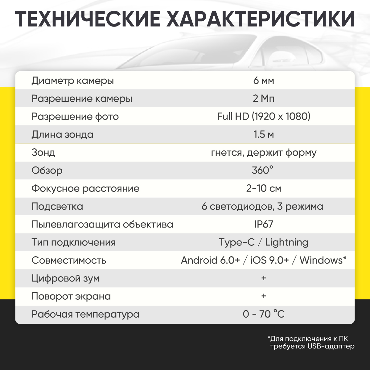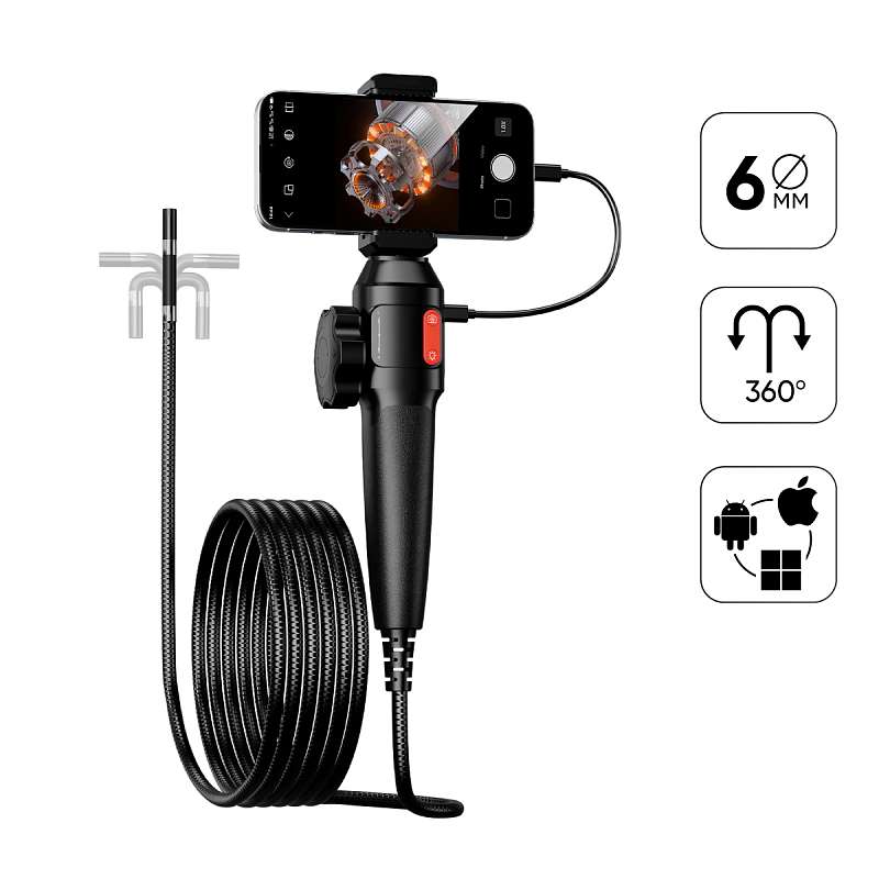 Поворотная камера с двухсторонней артикуляцией 360° плавно управляется с рукоятки, что позволяет одной рукой изменять положение камеры и осматривать слепые зоны без лишних усилий. Камера с разрешением 1920×1080 / 2 Мп передает четкое и детализированное изображение на смартфон или компьютер через USB-подключение (для ПК без разъема Type-C необходим переходник с USB 3.0, не входит в комплект).
