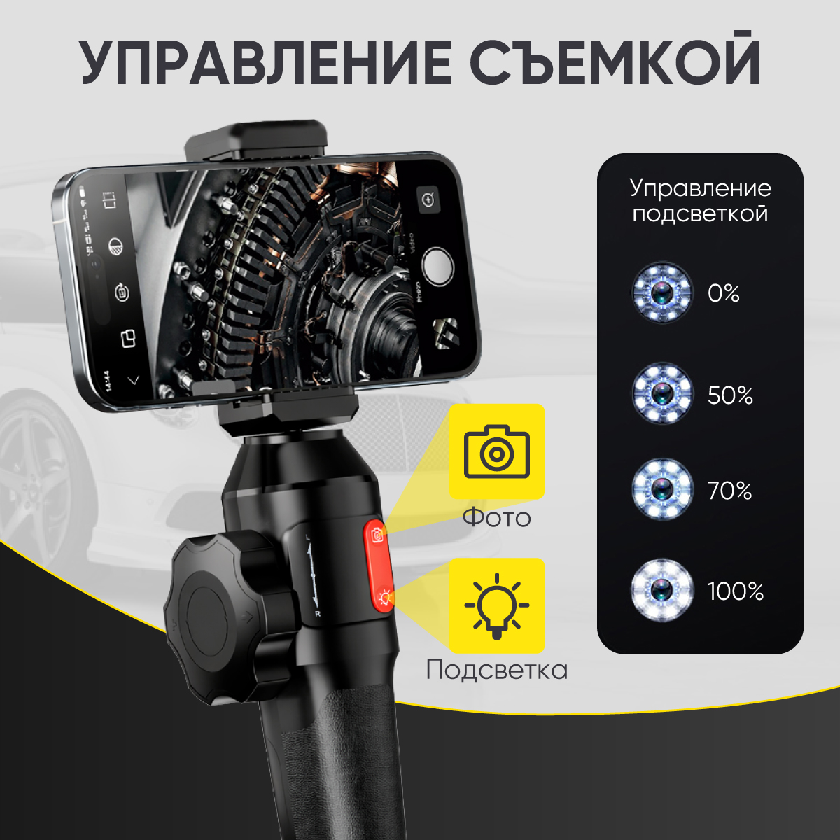Яркая LED-подсветка с 6 светодиодами и 3 режимами работы обеспечивает хорошую видимость даже в темных полостях. Горячая кнопка «Фото» позволяет быстро фиксировать результат осмотра. Запуск видеозаписи производится из приложения.