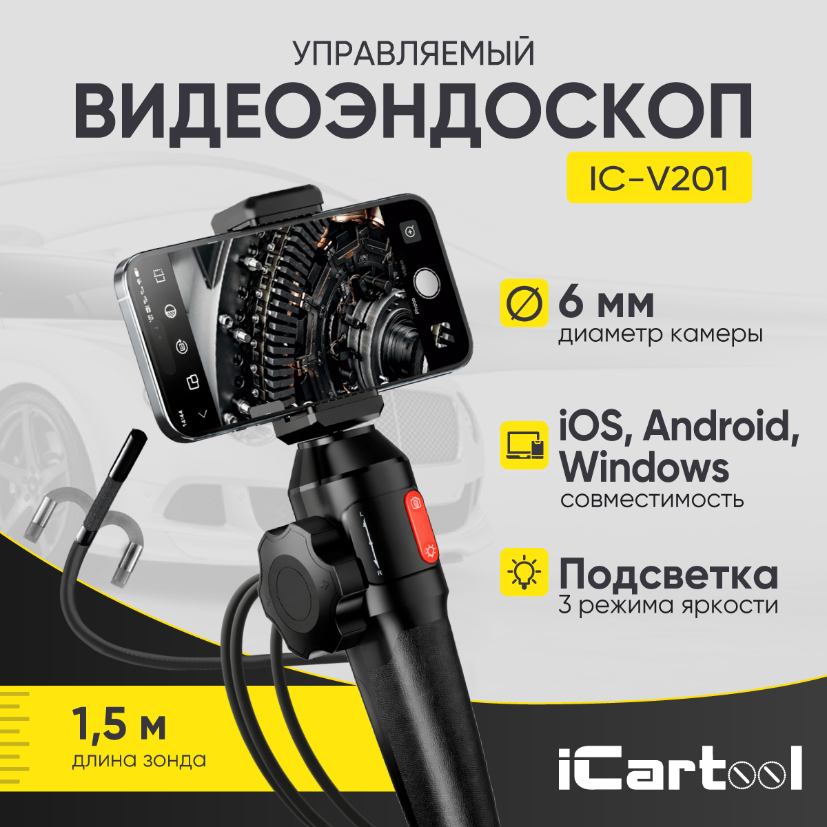 Видеоэндоскоп управляемый USB, 2Мп, 1920x1080, 1.5м, 6мм, 360° iCartool IC-V201 Рукоять видеоэндоскопа с держателем телефона и гибким зондом Ø 6мм