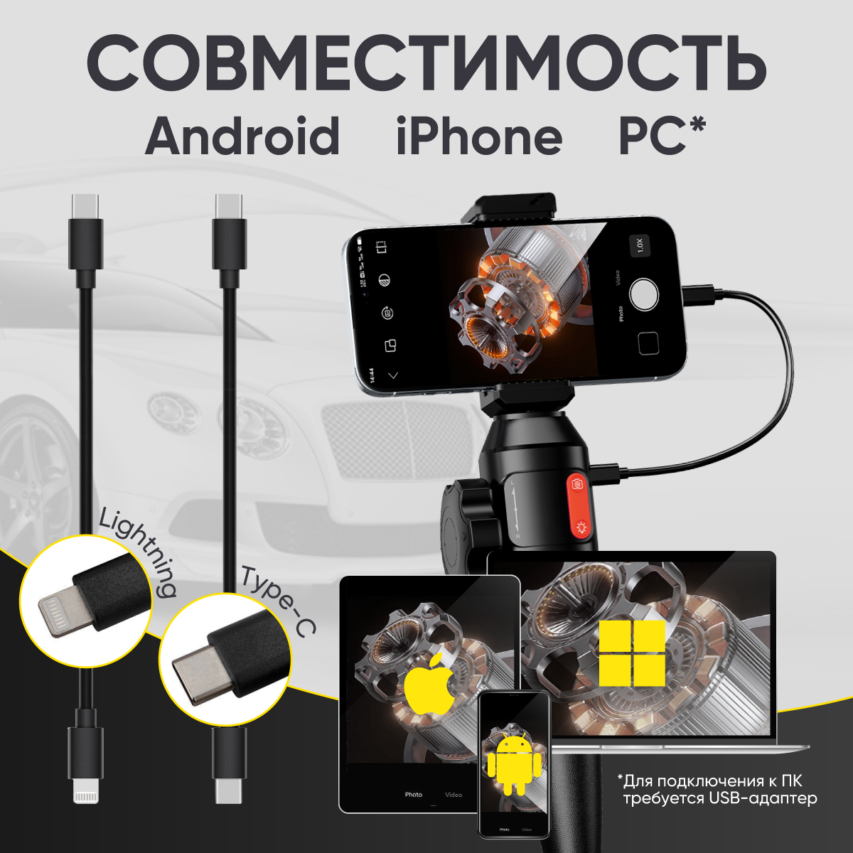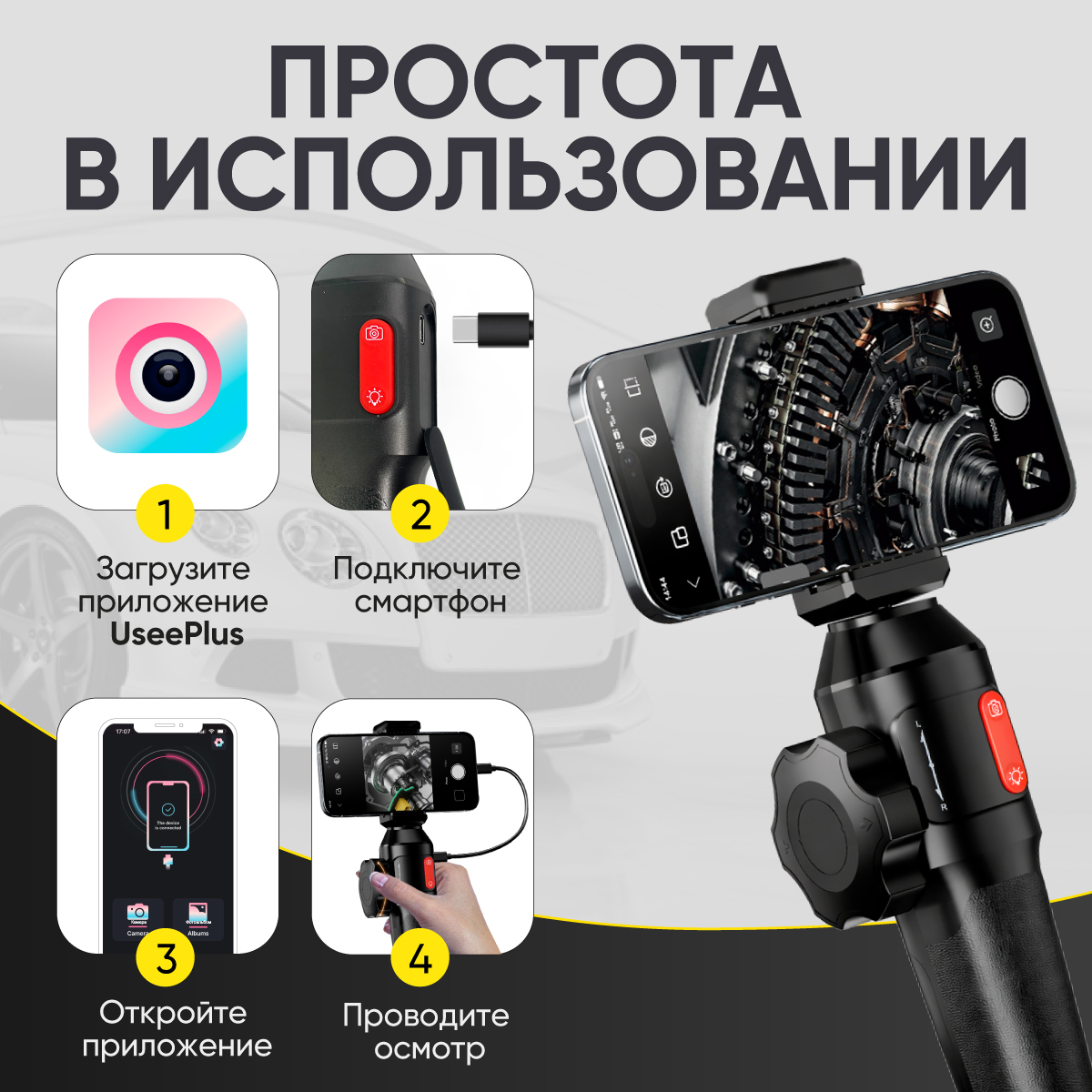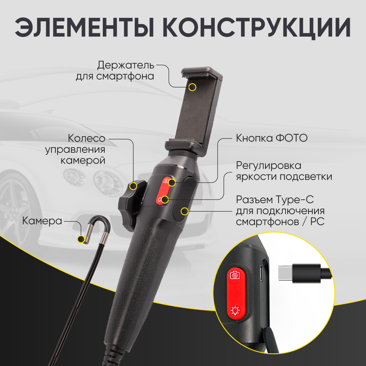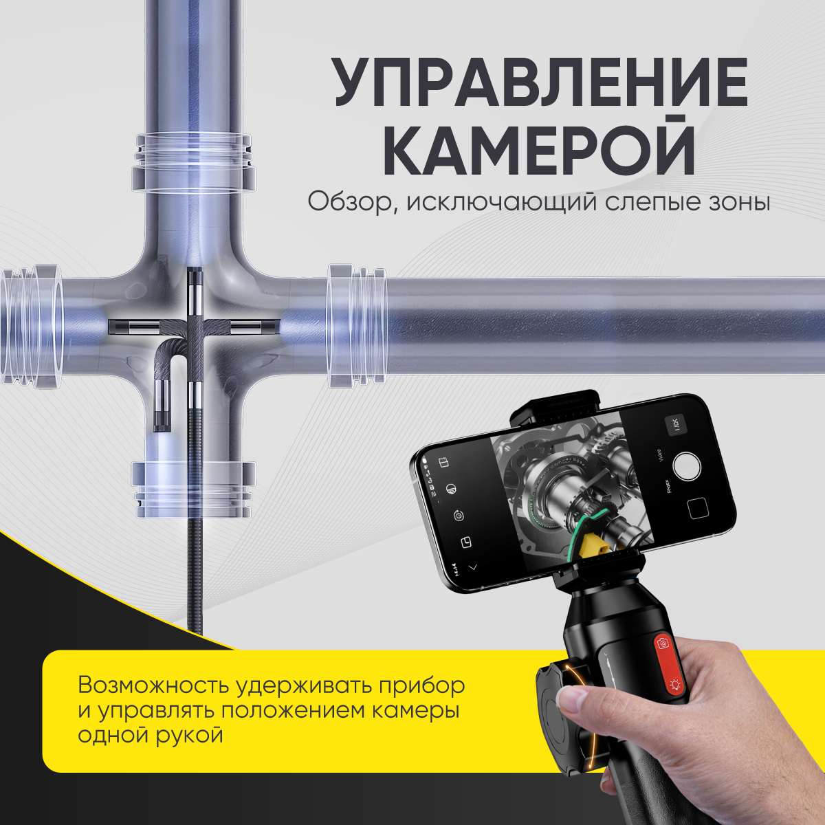 Рукоять видеоэндоскопа с держателем телефона и гибким зондом Ø 6мм