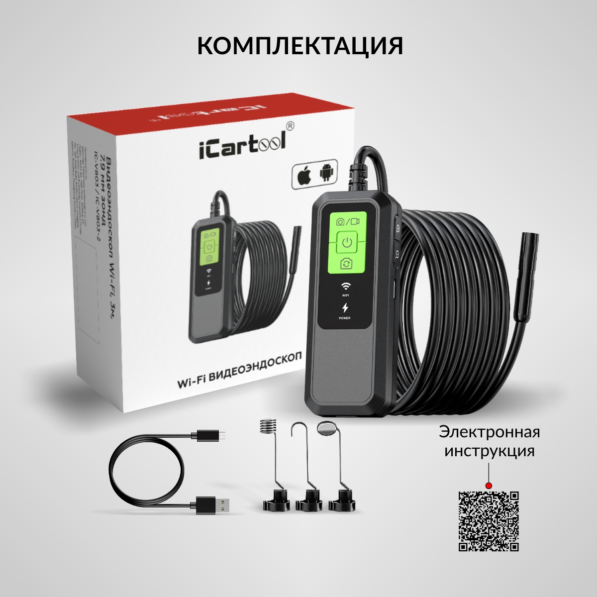 Wi-Fi видеоэндоскоп iCartool IC-V803 оснащён QHD-камерой 2560×1440 и полужестким зондом 3 м с памятью формы, обеспечивая четкое изображение труднодоступных областей. Передача видео на смартфон или планшет (iOS/Android) осуществляется через встроенный Wi-Fi модуль с аккумулятором на 2,5 часа работы. Благодаря регулируемой LED-подсветке, защите IP67 и комплекту насадок эндоскоп подходит для автодиагностики, осмотра труб, вентиляции и профессионального использования.