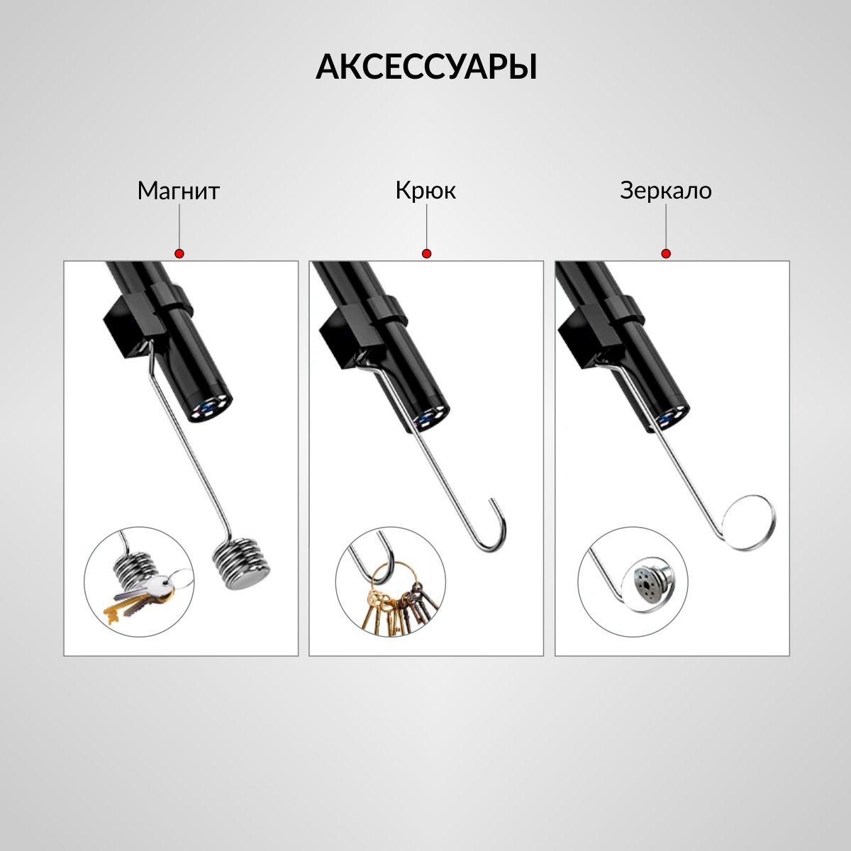 В комплект входят вспомогательные насадки (крюк, магнит, зеркало), что расширяет список выполняемых задач (крюк для работы с электропроводкой, магнит для извлечения металлических предметов из труднодоступных мест).