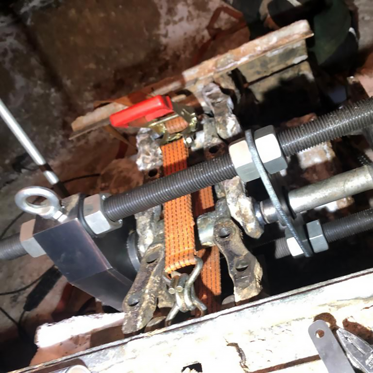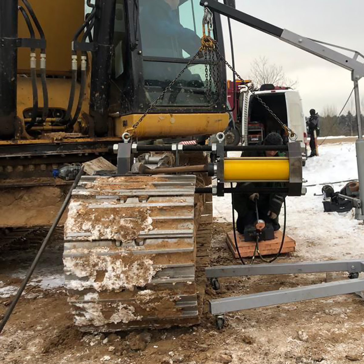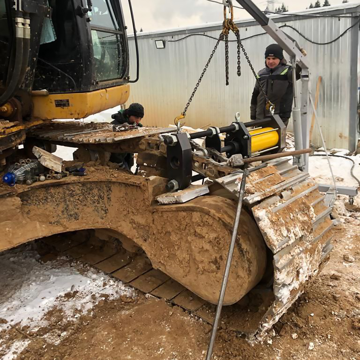 - Манометр на ручном гидравлическом насосе позволяет контролировать процесс выпрессовки / запрессовки пальца гусеничной цепи.